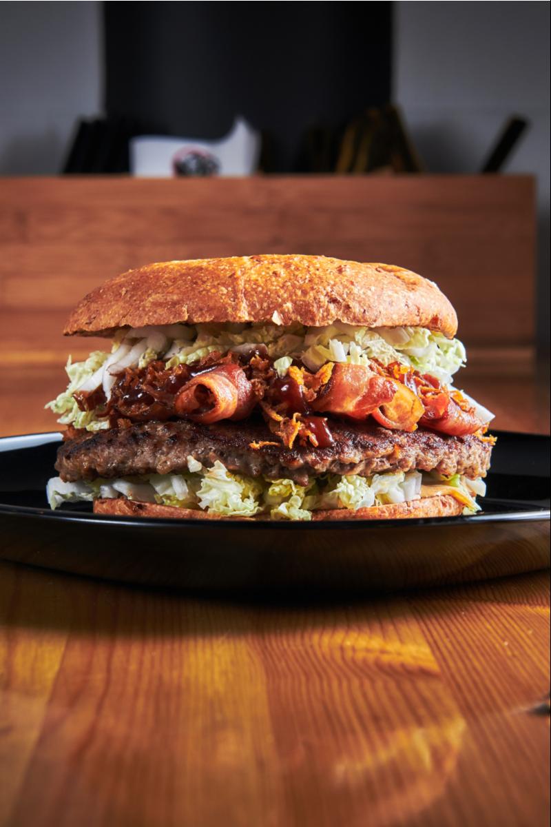 Bacon, roasted onion, BBQ sauce, Chinese cabbage, dressing, onion, and pickles. Allergen: soy, eggs, mustard, oats and wheat